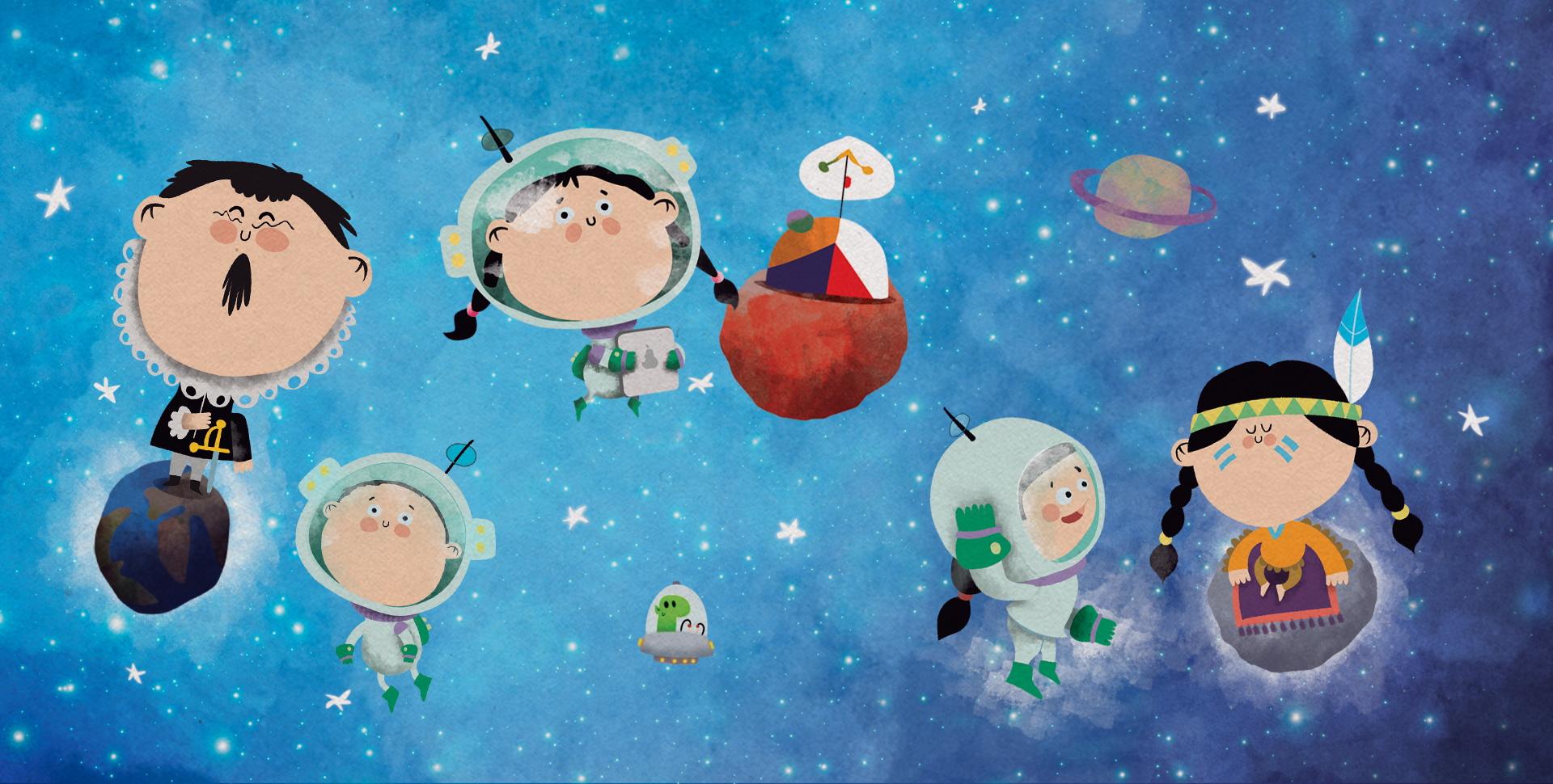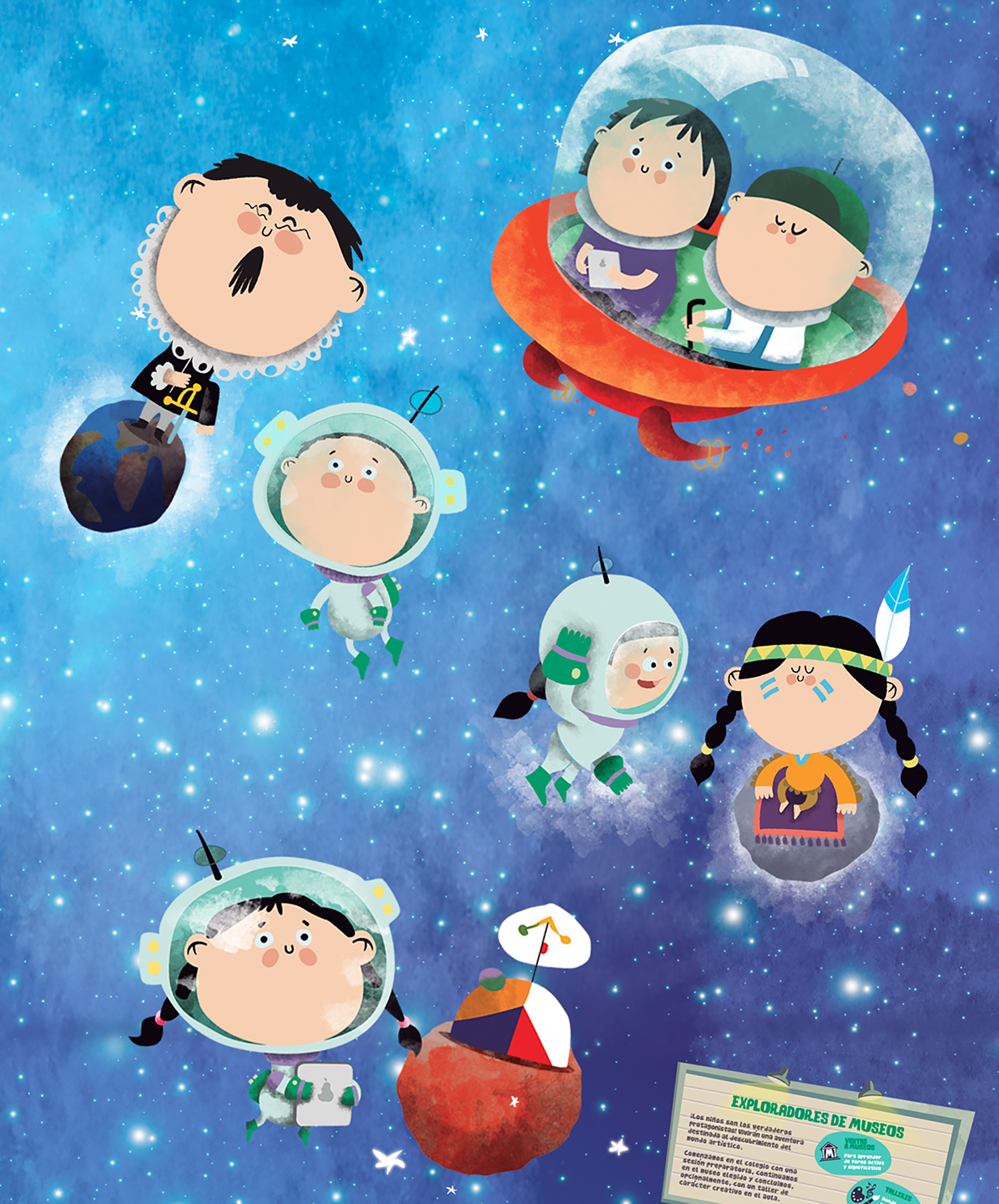 Con las ilustraciones, la tipografía y la dirección de arte creé un universo jovial en el que los niños exploran nuevos mundos artísticos, sumergiéndose en el arte como intrépidos aventureros espaciales.