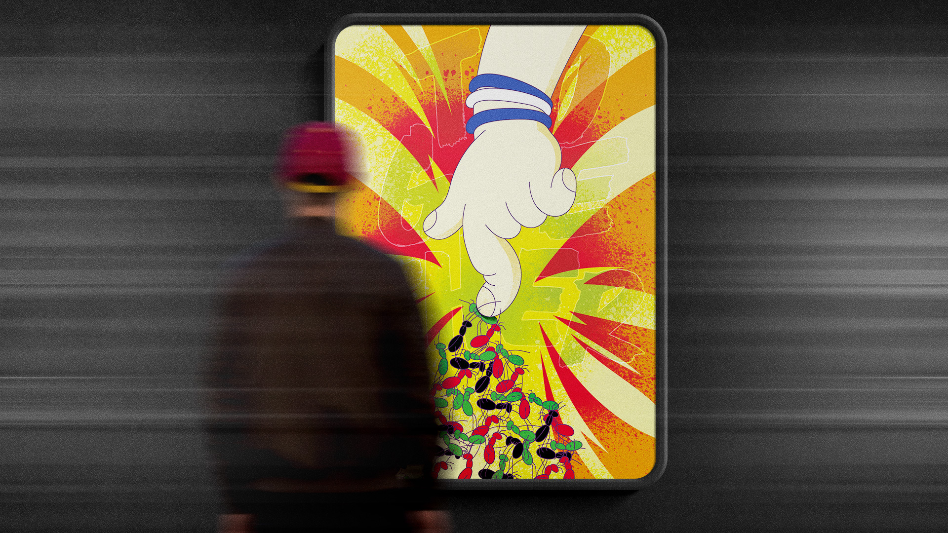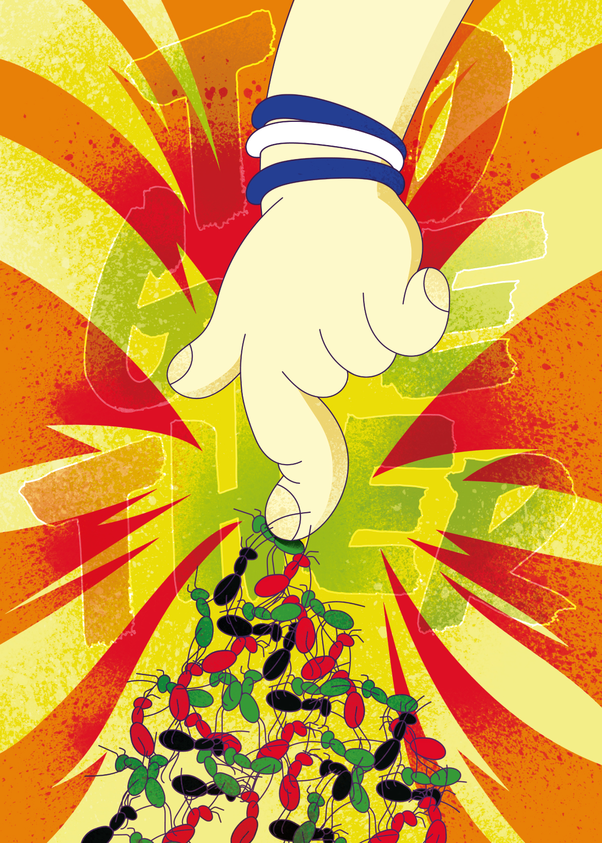 Mediante una composición clara y potente, una mano dominante ocupa el eje central mientras, debajo, un conjunto de hormigas forman una masa dinámica. Esta oposición visual genera una lectura directa sobre la relación entre poder y colectividad, fragilidad y resistencia, sobre la desproporción de fuerzas y la mecánica del poder de deshumanizar al bando contrario. La gráfica permite múltiples interpretaciones personales.